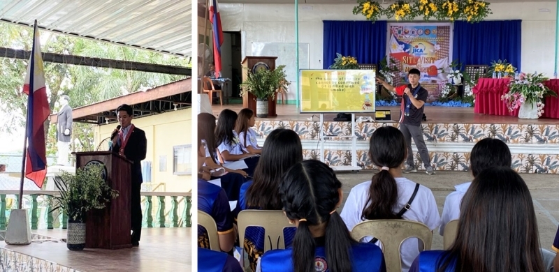 At the outset of the visit, the JOCV members presented their respective activity reports. These included presentations by Ms. KANAZAWA, engaged in science education in La Union Province; Ms. DOMON, working in community development in La Union Province; and Mr. YAMAMOTO, active in disaster risk reduction and management in Benguet Province. Following the reports, the Ambassador observed a science experiment class conducted by Ms. Kanazawa and local teachers, and a disaster preparedness seminar led by Mr. Yamamoto.