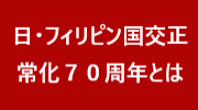 日・フィリピン国交正常化70周年 令和7年12月10日 日・フィリピン国交正常化70周年とは お知らせ 2025年12月10日 2026年日・フィリピン友好年(国交正常化70周年)記念ロゴマークの決定 関連リンク 外務省(フィリピン共和国) 在フィリピン日本国大使館 在セブ日本国総領事館 在ダバオ日本国総領事館